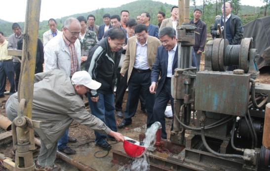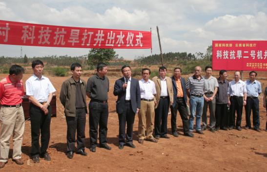 4月21日上午10点,在云南陆良县小百户镇兴隆村干裂的土地上,由吉大专家用核磁共振找水仪的探测打出的第一口井即将出水。兴隆村的数百名村民老老少少挑着扁担、赶着牛车兴奋地赶来取水。为了纪念科技抗旱、真情相助的难忘时刻,云南省科技厅举办了“科技抗旱成井交接仪式”。吉大党委副书记兼副校长韩晓峰率领由仪器科学与电气工程学院党委书记余国友和段清明教授,建设工程学院党委书记王爱民、副院长赵大军教授组成的专家组亲临现场,参加了这一重要仪式。